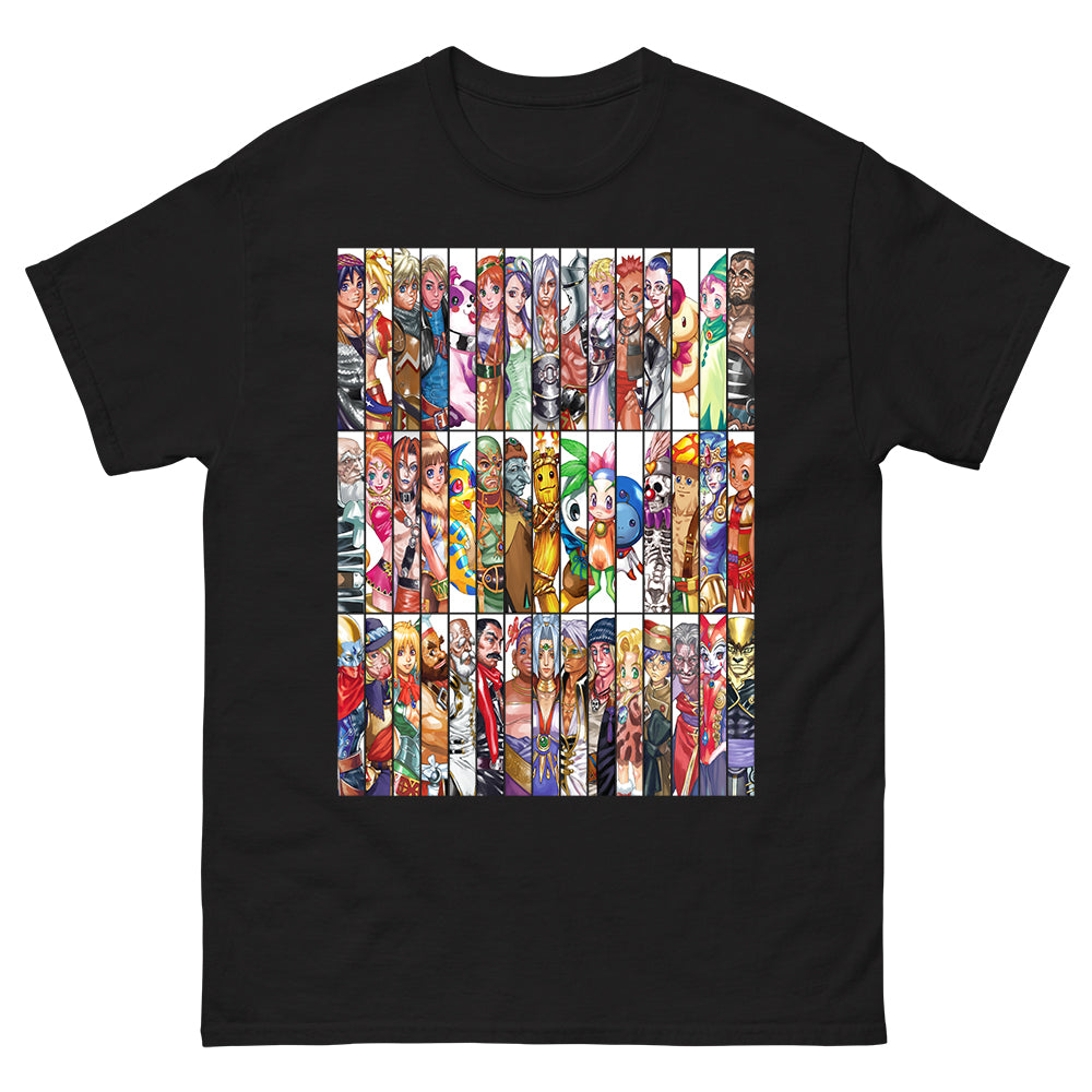 Chrono Cross T-shirt with portraits of Doc, Draggy, Fargo, Funguy, Glenn, Greco, Grobyc, Guile, Harle, Irenes, Janice, Karsh, Kid, Korcha, Leah, Leena, Luccia, Lynx, Macha, Marcy, Mel, Miki, Mojo, NeoFio, Nikki, Norris, Orcha, Orlha, Pierre, Pip, Poshul, Radius, Razzly, Riddel, Serge, Skelly, Sneff, Sprigg, Starky, Steena, Turnip, Van, Viper, Zappa, and Zoah. Please note that up close the characters look pixelated.