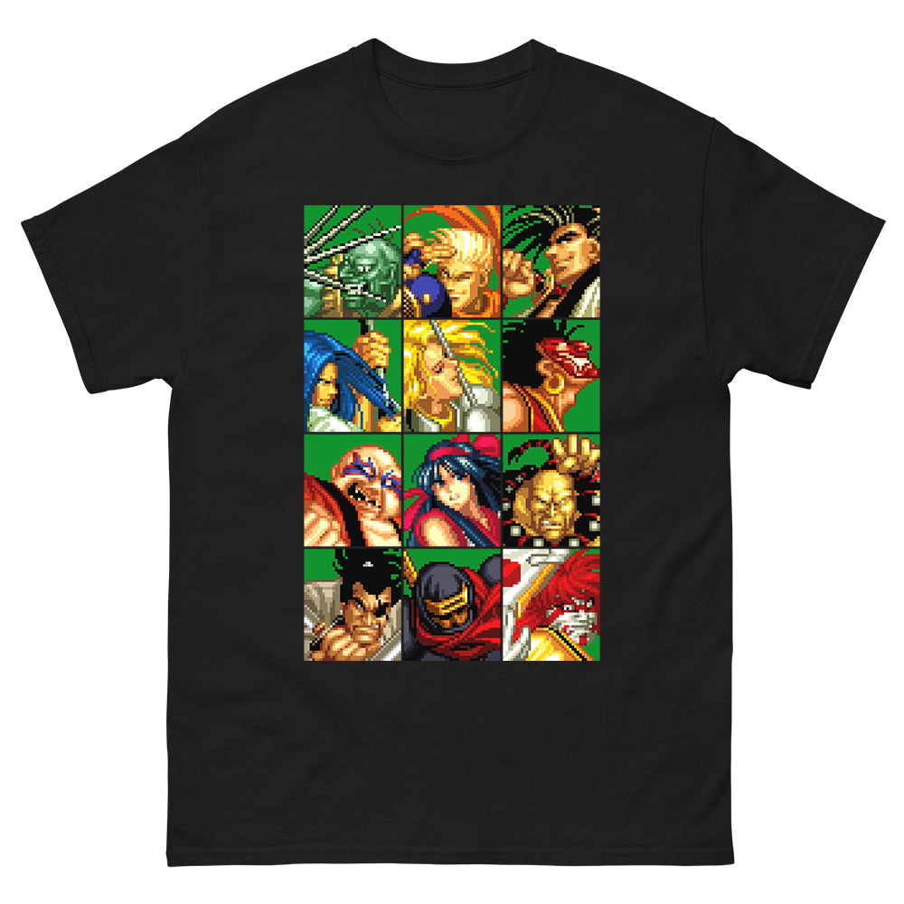 T-shirt with portraits of Haohmaru, Nakoruru, Kyoshiro Senryo, Earthquake, Galford D. Weiler, Ukyo Tachibana, Charlotte Christine Colde, Wan-fu, Tam Tam, Gen-an Shiranui, Hanzo Hattori, and Jubei Yagyu from Samurai Shodown.